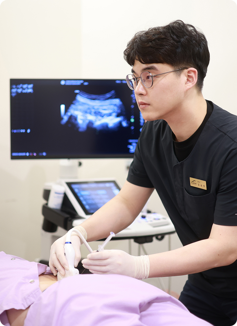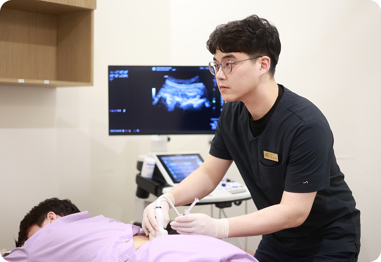 고해상도 초음파로 통증 원인을 정확히 진단하고 침 자입 과정을 실시간 확인하며 시술 정확도와 안전성을 높입니다.